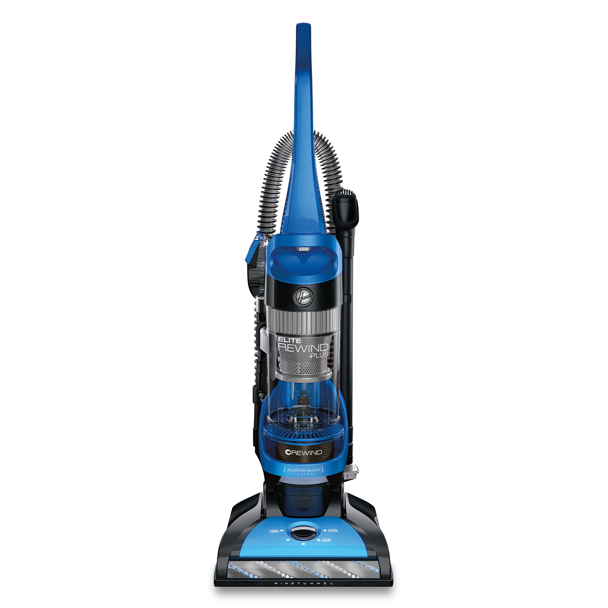 The Hoover? Elite Rewind Plus is ideal for Whole Home Cleaning from floor to ceiling and delivers powerful performance on every surface. WindTunnel technology and Multi-Cyclonic filtration lifts and removes surface debris and deep down embedded dirt with no loss of suction. The 25ft. power cord automatically retracts in seconds so you never have to wrap a cord again. An assortment of tools and an extra-long cleaning hose offers up to 12ft. of above floor reach to easily clean blinds. bookshelves and more. Plus. the Pet Turbo Tool easily removes stubborn pet hair from stairs and upholstery. while our AllergenBlock System captures dust and pollen particles and blocks* them from re-entering the air. For over 100 years. Hoover has re-imagined the way we clean. delivering a complete collection of trusted. innovative and effective solutions designed to make cleaning easier for active families so they can get back to what matters most.