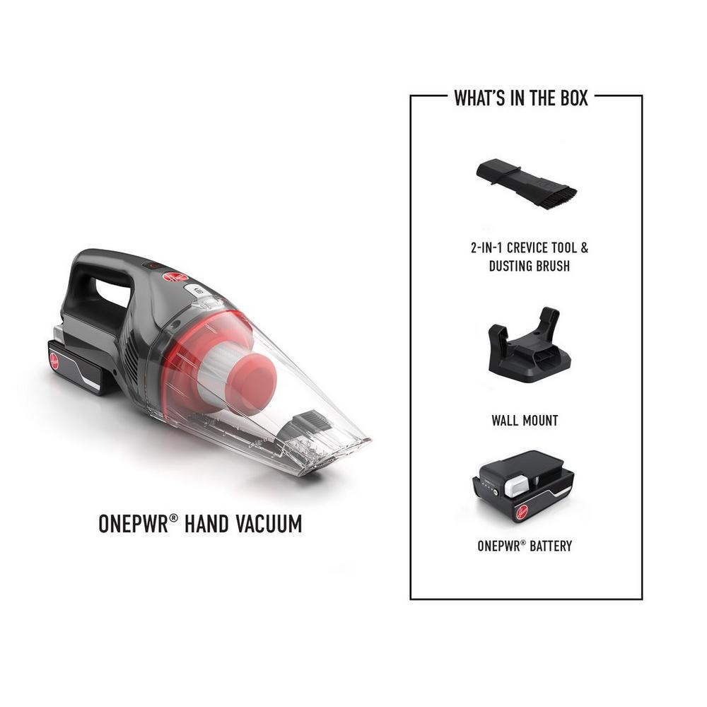 The Hoover ONEPWR? Hand Vacuum is the perfect cleaning companion that combines lightweight portability with powerful suction. No mess is too tough to tackle. no matter how unexpected or challenging it may be. Equipped with a 2-in-1 crevice tool and dusting brush. effortlessly reach and clean every nook and cranny. leaving no hard-to-reach areas untouched. Once clean-up is done. store the ONEPWR? Hand Vacuum on the included wall mount for convenient storage. Get ready to keep the clean going with the ONEPWR? Battery System to clean anywhere without interruption.