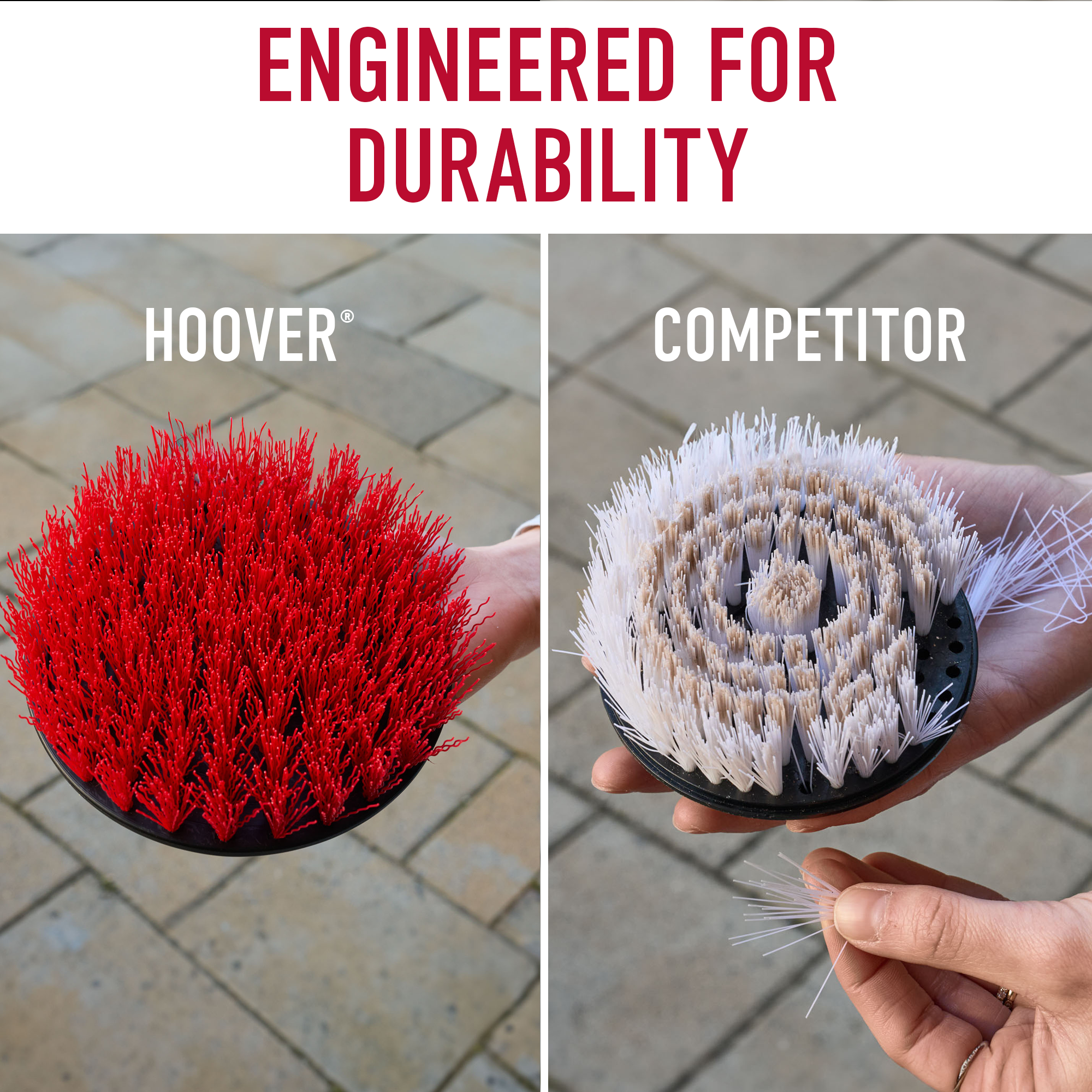 The Hoover ONEPWR Telescoping Cordless Scrubber ensures that no mess is out of reach. With over four feet of extended scrubbing reach and easy. powered scrubbing. tackling messes inside and outside of the home is a breeze. The ONEPWR battery is protected in a water-resistant housing. which makes cleaning decks. siding. bathrooms. boats and more a breeze. And with a pivoting brush head and interchangeable brushes. it is easy to power through any mess. no matter the angle.