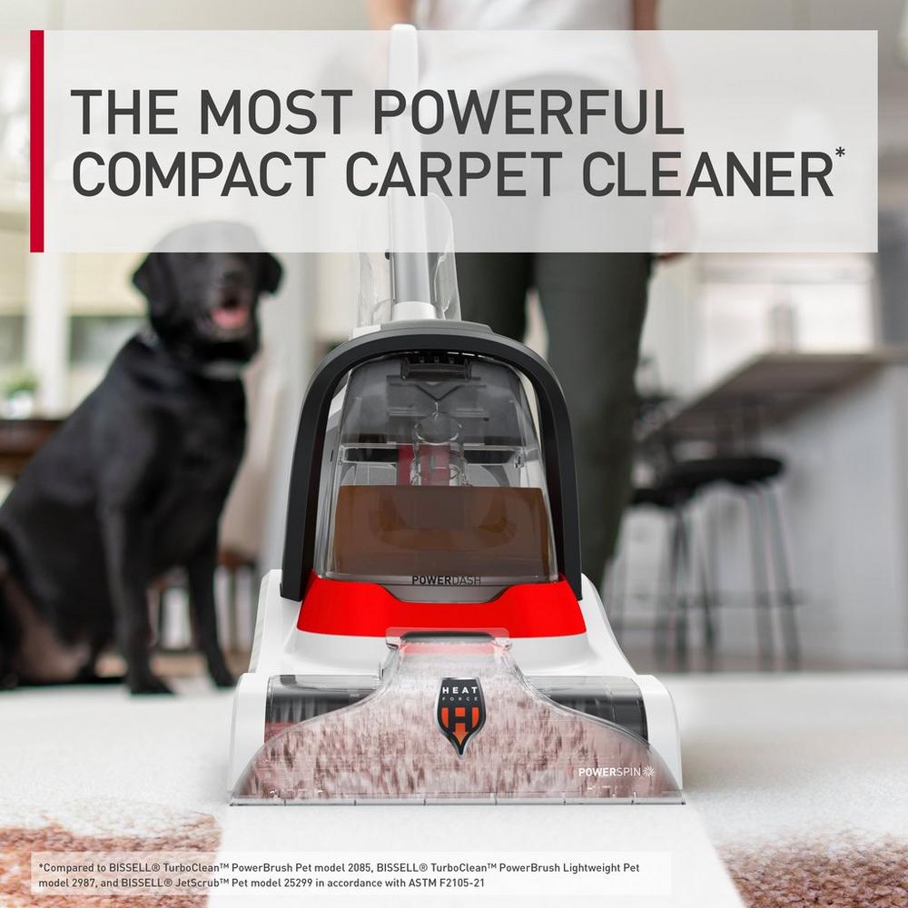The new & improved Hoover? PowerDash? Pet Compact Carpet Cleaner is the most powerful compact carpet cleaner* designed for convenient and effortless cleaning anywhere in your home. The lightweight. grab & go portability makes cleaning from room to room easy while the stronger suction helps you target deep embedded stains. Our Heatforce? Technology also assists with dry time so you can get back on your carpets faster. With even greater efficiency and powerful cleaning performance. the PowerDash? Pet Compact Carpet Cleaner is perfect for tackling any pet mess with ease.