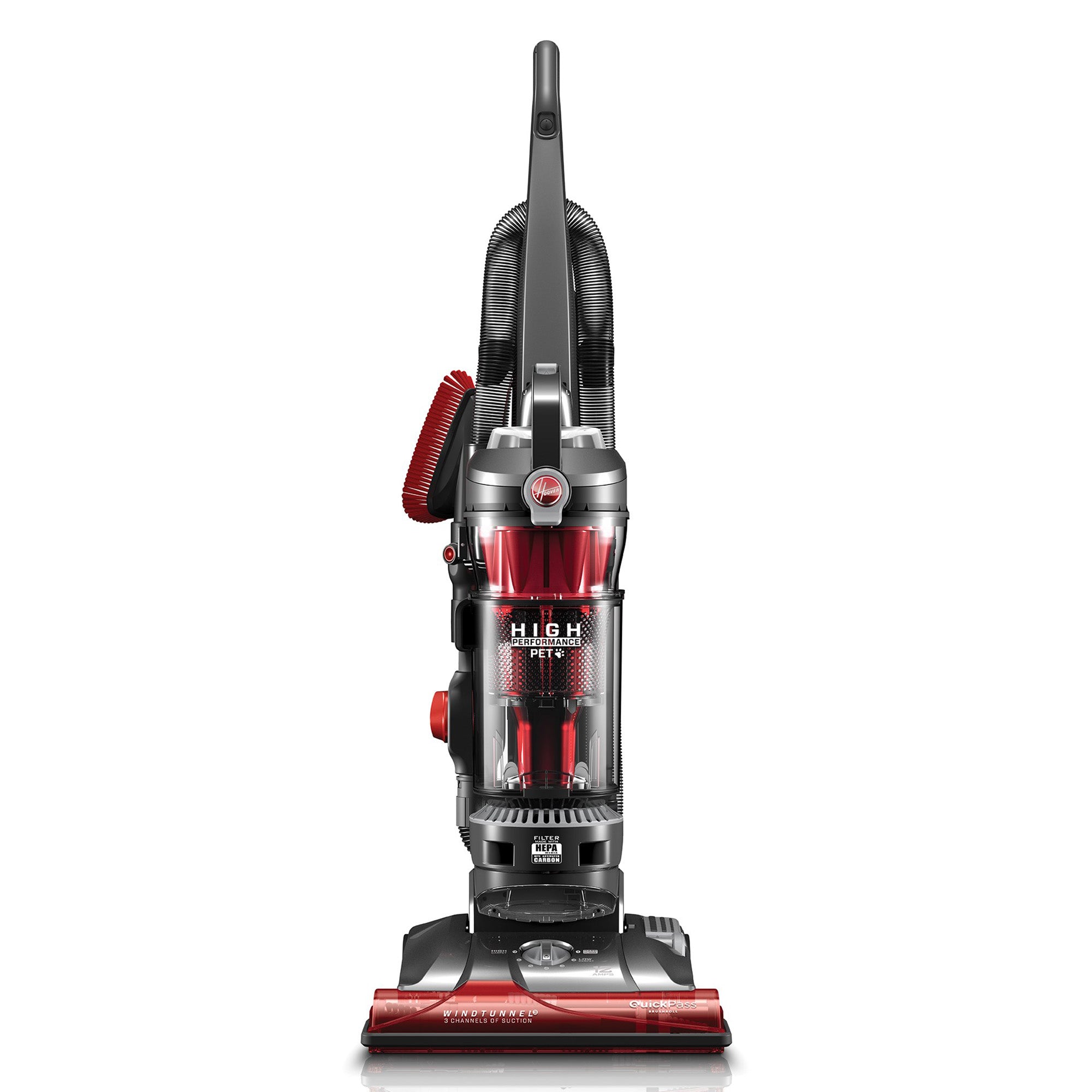 Tackle busy household carpets with the Hoover WindTunnel 3 High Performance Pet Vacuum Cleaner. It features three suction channels and 13 cyclones to remove embedded dirt from any corner or crevice. With a 30-ft. power cord. you have the freedom to vacuum large rooms without unplugging. When you’re done. empty the bottom-release dirt cup.
